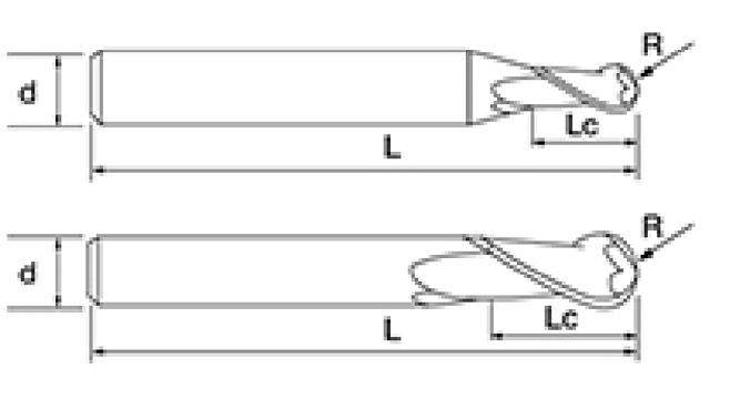 | Nem. | Átmérő D | R Szög R | Fuvola hossza Lc | Teljes hossz L | Shank Dia d | Pengeszám F |