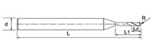 | Nem. | Átmérő D | R Szög R | Fuvola hossza Lc | Hatásos hossz L1 | Teljes hossz L | Shank Dia d | Pengeszám F |