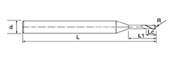 | Nem. | Átmérő D | R Szög R | Fuvola hossza Lc | Hatásos hossz L1 | Teljes hossz L | Shank Dia d | Pengeszám F |
