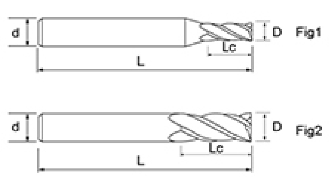 | Nem. | Átmérő D | Fuvola hossza Lc | Teljes hossz L | Shank Dia d | Pengeszám F |