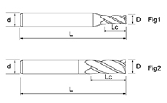 | Nem. | Átmérő D | Fuvola hossza Lc | Teljes hossz L | Shank Dia d | Pengeszám F |