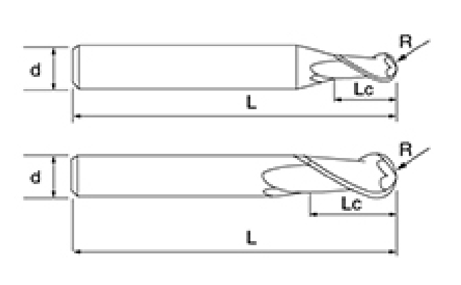 | Nem. | Átmérő D | R Szög R | Fuvola hossza Lc | Teljes hossz L | Shank Dia d | Pengeszám F |