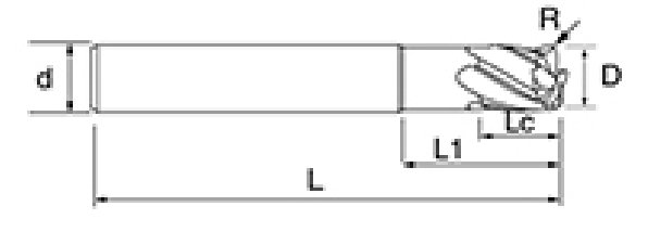 | Nem. | Átmérő D | R Szög R | Fuvola hossza Lc | Hatásos hossz L1 | Teljes hossz L | Shank Dia d | Pengeszám F |