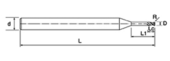 | Nem. | Átmérő D | R Szög R | Fuvola hossza Lc | Hatásos hossz L1 | Teljes hossz L | Shank Dia d | Pengeszám F |