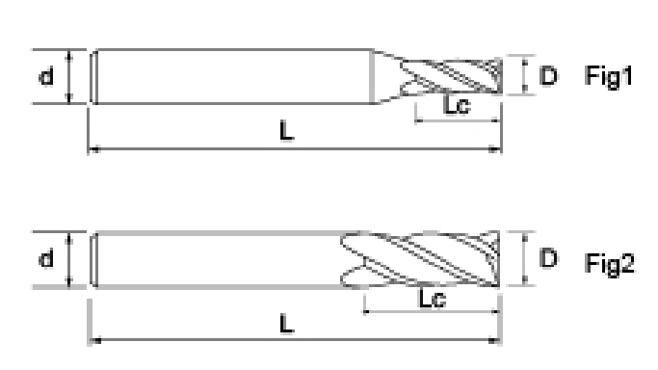 | Nem. | Átmérő D | Fuvola hossza Lc | Teljes hossz L | Shank Dia d | Pengeszám F |