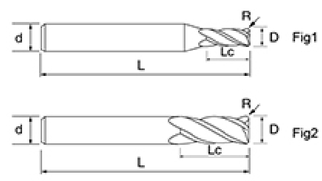| Nem. | Átmérő D | R Szög R | Fuvola hossza Lc | Teljes hossz L | Shank Dia d | Pengeszám F |