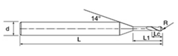 | Nem. | Átmérő D | R Szög R | Fuvola hossza Lc | Hatásos hossz L1 | Teljes hossz L | Shank Dia d | Pengeszám F |