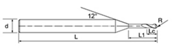 | Nem. | Átmérő D | R Szög R | Fuvola hossza Lc | Hatásos hossz L1 | Teljes hossz L | Shank Dia d | Pengeszám F |