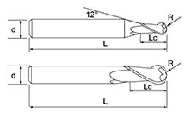 | Nem. | Átmérő D | R Szög R | Fuvola hossza Lc | Teljes hossz L | Shank Dia d | Pengeszám F |