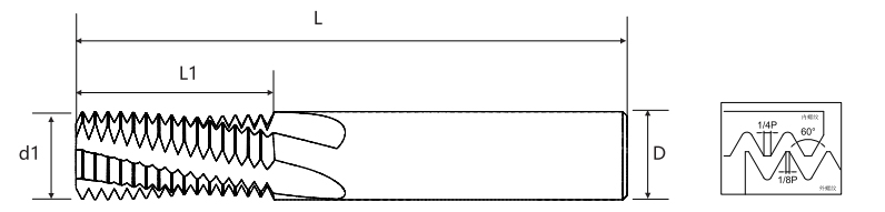 | Pitch | Durva fogak UNC | Finom fogak UNF | Ultra finom fogak UNEF | Penge átmérő d1 | Hatékony pengehossz L1 | Fogantyú átmérője D | Teljes hossz L | Pengeszám | Alsó furat átmérője |